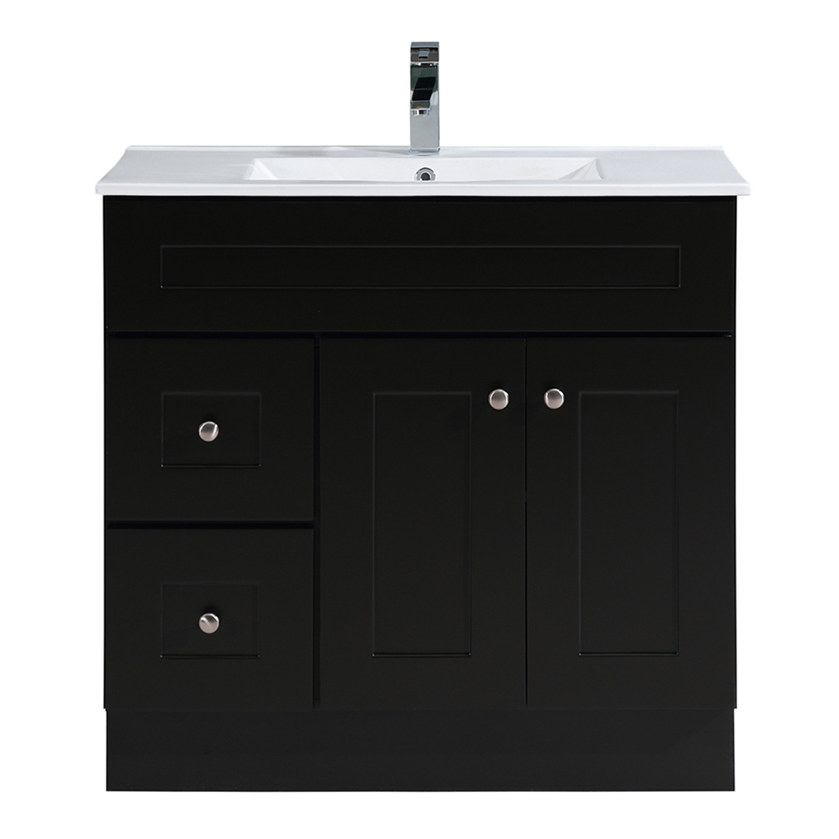 The Newport line of Vanities with thin ceramic basins are a ready to assemble economical line which is perfect for any powder room or Bathroom. The line offers style and function. These knock down cabinets are completely finished and ready to assemble. Features High Quality MDF Cabinets with Ceramic Basins. The soft close drawers and doors are whisper quiet. Available in 4 colours and sizes; the Newport line offers a simple style in every bathroom.