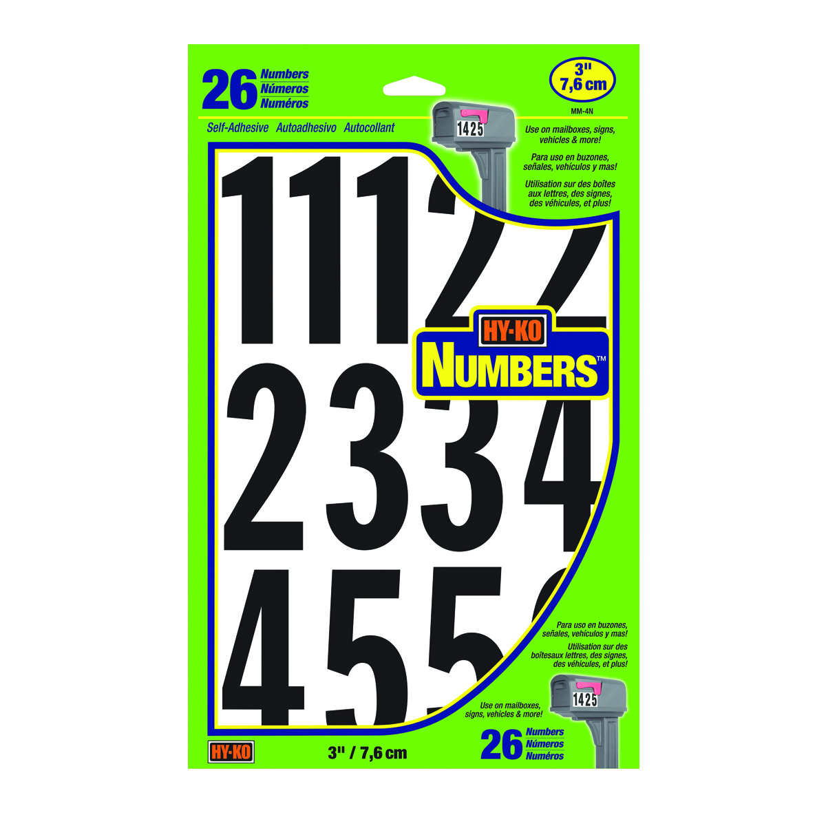 3 inch black letters on 3-1/4 inch white vinyl panel. Self adhesive. Numbers 1 thru 9. 26 vinyl numbers on a card. Packaged assortment contains six ones; four twos; and two each 3 thru 0. Commonly used on mailboxes and such.