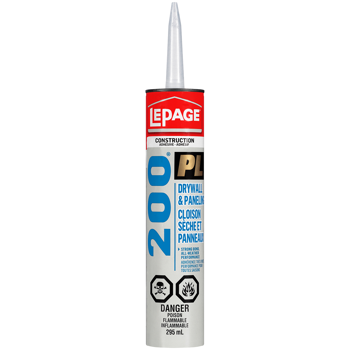 LePage® PL® 200 is a premium grade; interior or exterior construction adhesive in two caulking gun cartridge sizes. It is specially formulated to provide a water resistant bond that offers rapid bond development; the ability to bridge minor framing irregularities and long acting adhesion. It minimizes unsightly nails and hammer dents.
