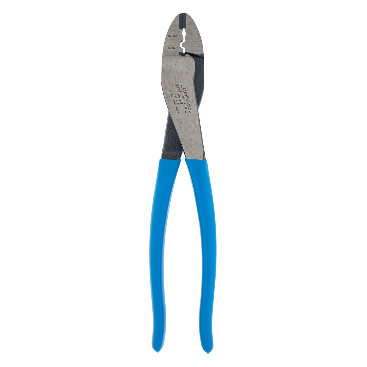 The CHANNELLOCK® 9½in Crimper/Cutter offers a sleek nose design that easily maneuvers into tight places to make the perfect crimp on both insulated and non-insulated solderless connections and terminals. Precise laser heat-treated cutting edges and durable high carbon steel make this the only crimper you'll ever need. CHANNELLOCK® Crimper/Cutters are made in USA and forged from high carbon steel that is specially coated for ultimate rust prevention.