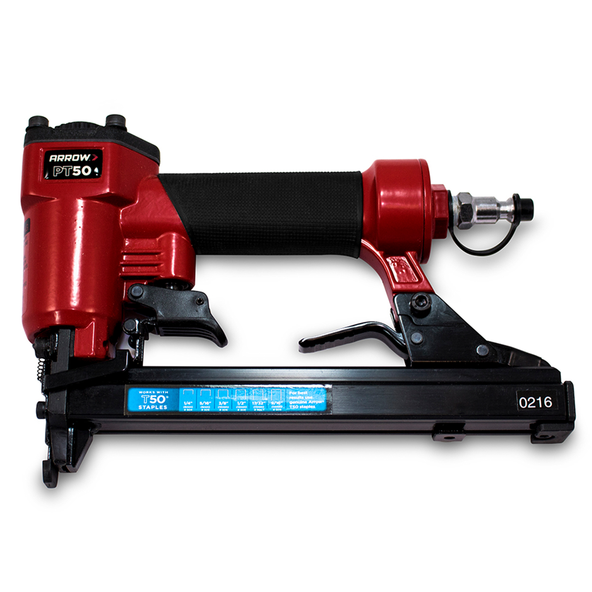 The Arrow PT50 delivers serious pneumatic tool performance at a price everyone will love. Packed with features like an easy-load magazine; overmolded comfort grip; adjustable exhaust cover; and contact safety – this tool has the power and versatility to tackle any home project. And; it’s capable of bump firing to speed big jobs along. PT50 comes with all necessary fittings and operates on home compressors up to 100psi.
