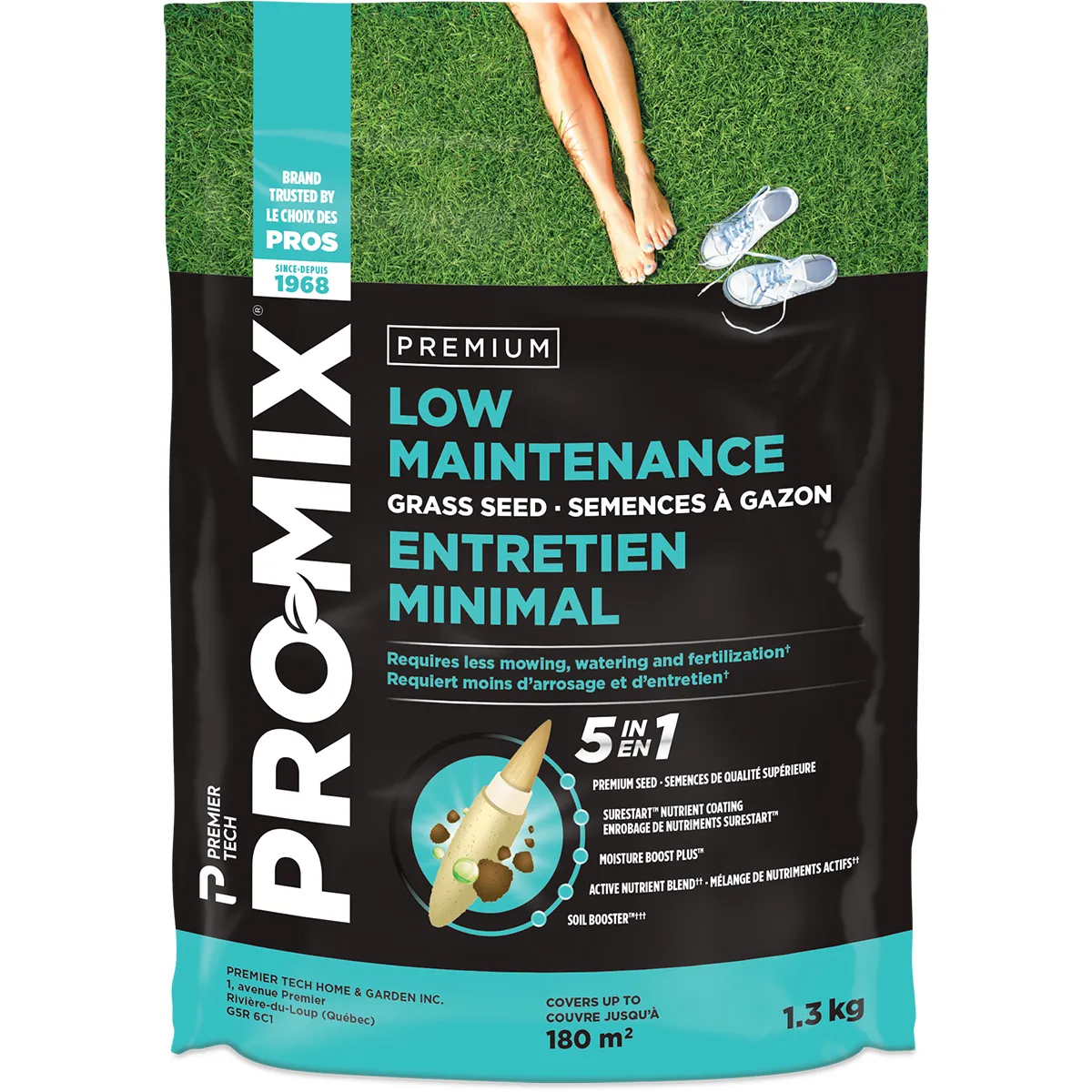 Save time and effort with pro-mix premium low maintenance grass seed.