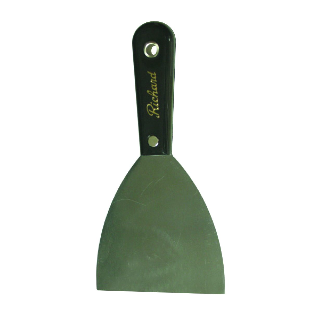 0.065 in thick. Full tang blades; heat-treated; tempered; ground; mirror-polished and lacquer-sealed. Flexible taping knife blade is hollow ground on both sides. Handle made from polypropylene. Patches small holes and cracks.