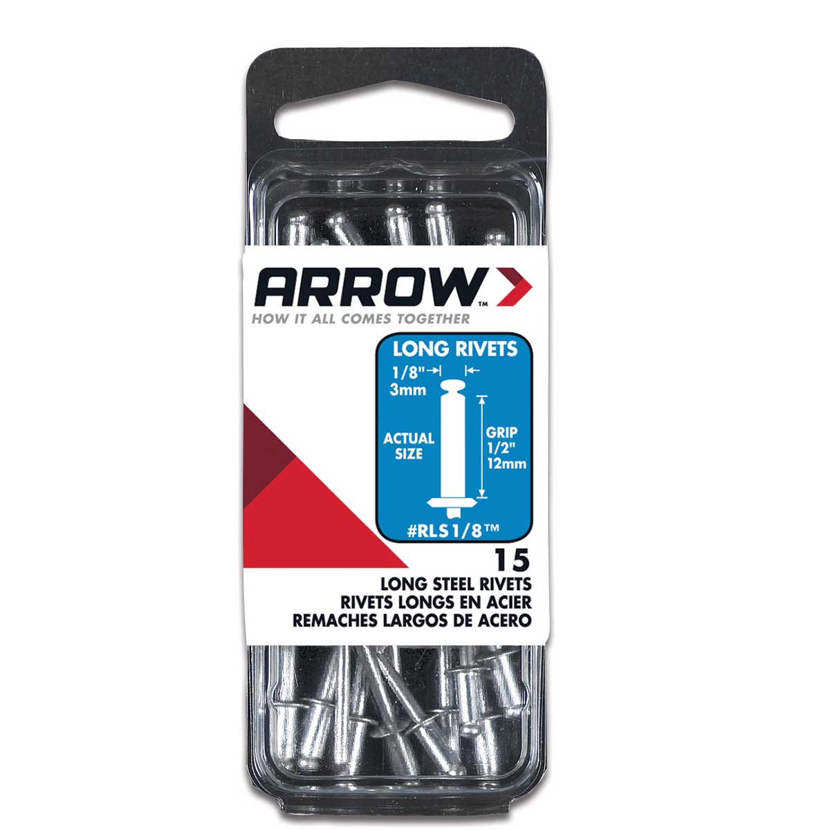 Rivets steel package; 1/8 inch long; 1/2 inch grip range; pack of 15 Use steel rivets for very heavy duty jobs and when riveting steel to steel. Use aluminum rivets for lighter weight jobs and materials such as aluminum; fabrics; plastics; leather; etc. Use washers when joining soft materials or when existing hole is overs ize.