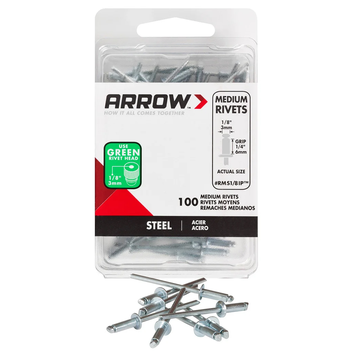 Rivets steel industrial pak boxed 1/8 inch diameter; 1/4 inch grip range; box of 100 Use steel rivets for very heavy duty jobs and when riveting steel to steel. Use aluminum rivets for lighter weight jobs and materials such as aluminum; fabrics; plastics; leather; etc. Use washers when joining soft materials or when existing hole is oversize. Use steel rivets for very heavy-duty jobs and when riveting steel to steel.