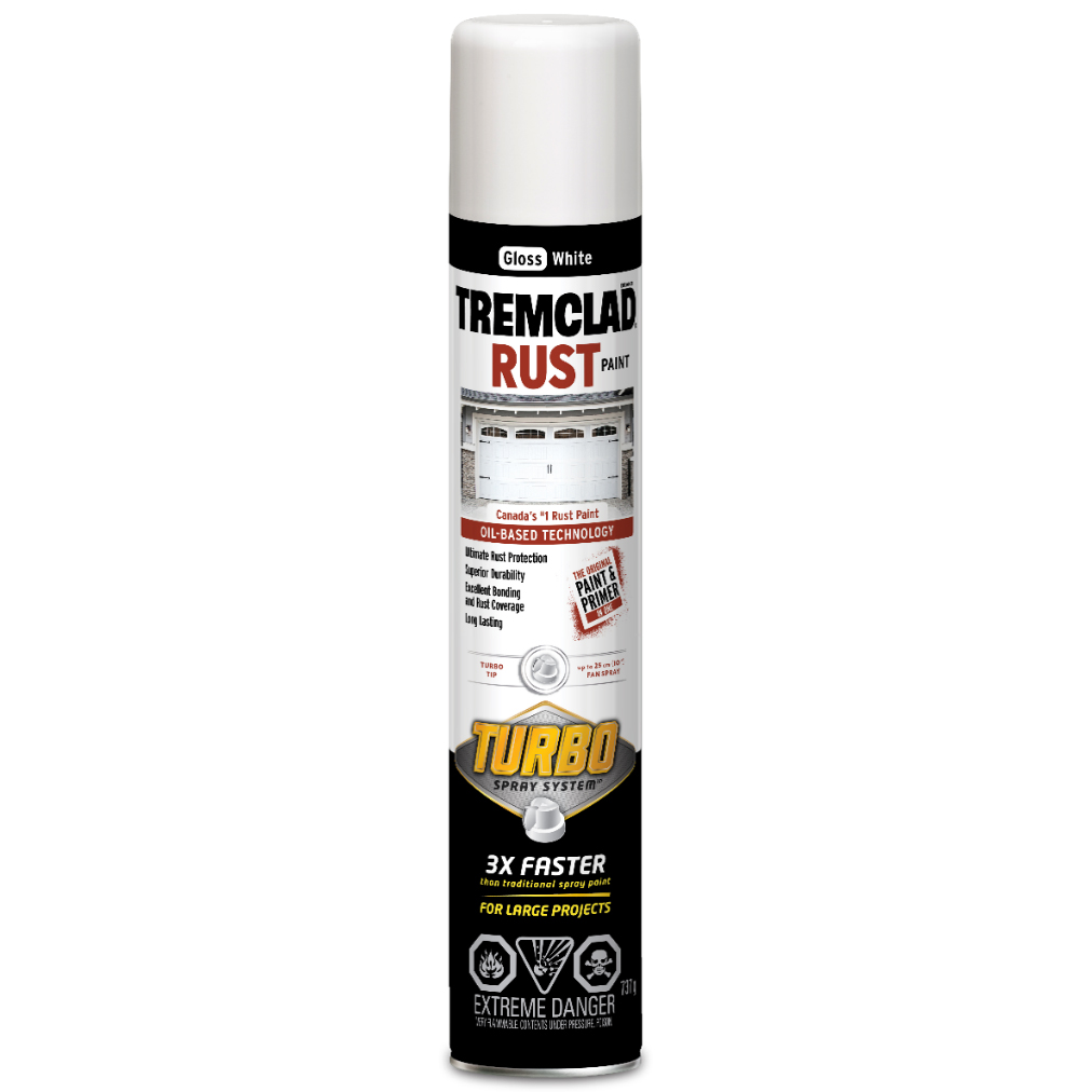 Rust-Oleum® pairs the trusted long-lasting durability of Tremclad Rust Paint with the Innovative Turbo Spray System™ to unleash 3X more paint per second. Now you can tackle your largest projects faster and easier than ever.