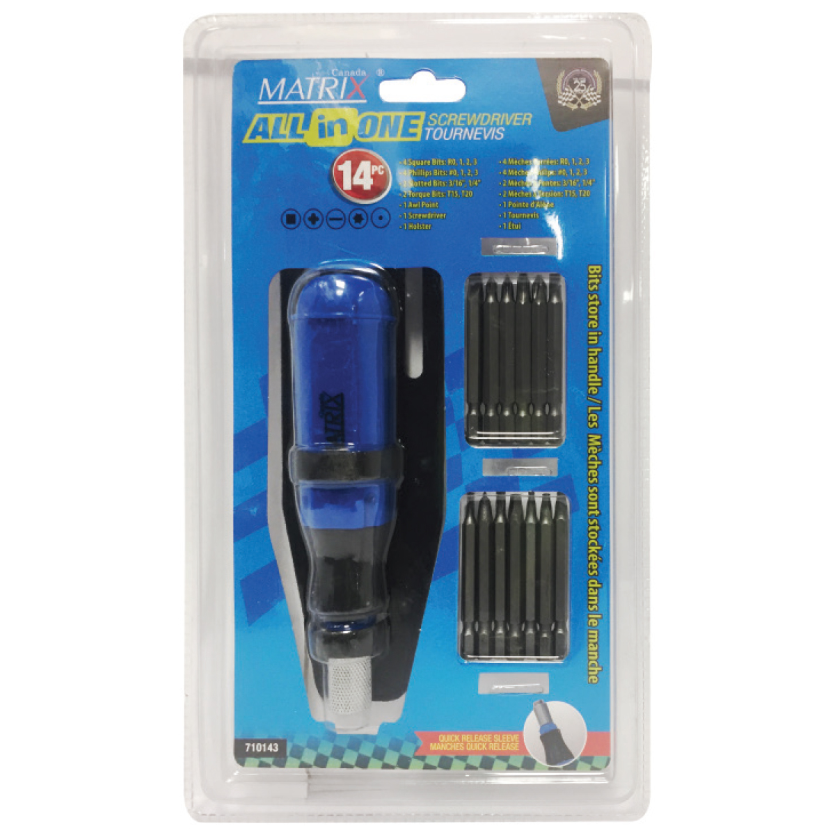 Contains: (4) Square: S0; S1; S2; S3 | (4) Phillips: PH0; PH1; PH2; PH3 | (2) Slotted: 3/16in; 1/4in | (2) Torx: T15; T20 | (1) Awl point | (1) Screwdriver.