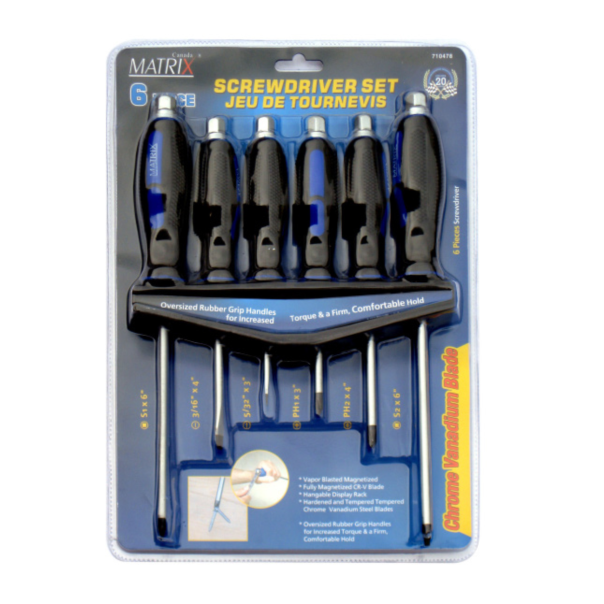 Contains: (2) square: S1 x 6in; S2 x 6in | (2) Slotted: 3/16in x 4in; 5/32in x 3in | (2) Phillips : PH1 x 3in; PH2 x 4in.