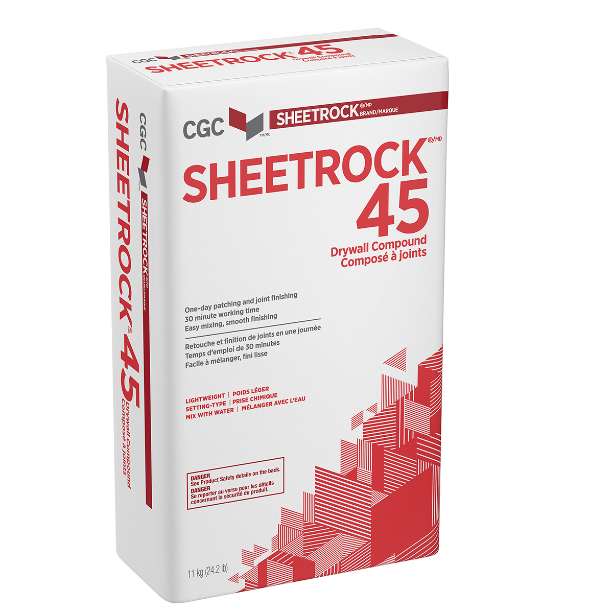 CGC Sheetrock® Brand 45 Setting-Type Drywall Compound is an excellent compound for embedding tape; bead; and trims. It's special formulation provides a lightweight product with a superior bond; permits same-day joint finishing and is easy to handle and sand. It is ideal for heavy fills and is virtually unaffected by humidity.