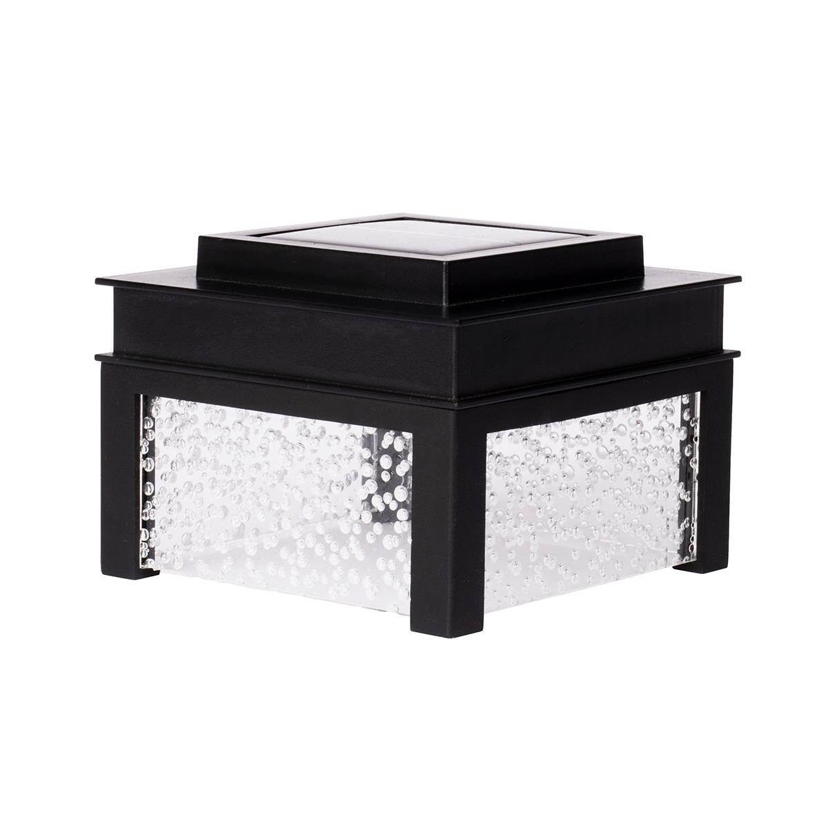 Solar bubble lens post cap light plastic construction black colour polycrystalline solar panel 8 x bright white smd (10 lumens) 1xaa 800mah- rechargeable ni-mh run time up to 8 hours on a full charge dimensions square 4. 33in x 2. 60in h fits 3. 56in x 3. 56in post full colour box.