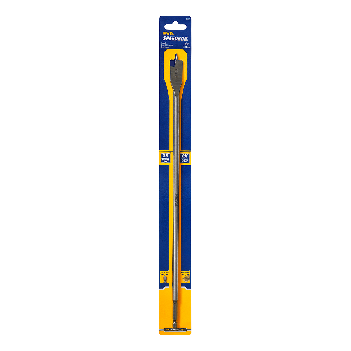 Extra-Long Spade Bits Feature Blue-Groove point and cutting edge for faster chip removal; 4x faster than standard spade bits. Double cutting spurs scribe the outside of the hole reducing breakout. 10% larger shank for added durability. 3-Flatted style shank. Not for use with bit extensions. Blue groove point and cutting edge for faster chip removal; double cutting spurs scribe the outside of the hole reducing breakout. Grooved hex shank prevents slipping in drill chuck or bit extension and fits all standard quick change chucks. Blue groove point and cutting edge for faster chip removal; double cutting spurs scribe the outside of the hole reducing breakout. Grooved hex shank prevents slipping in drill chuck or bit extension and fits all standard quick change chucks.