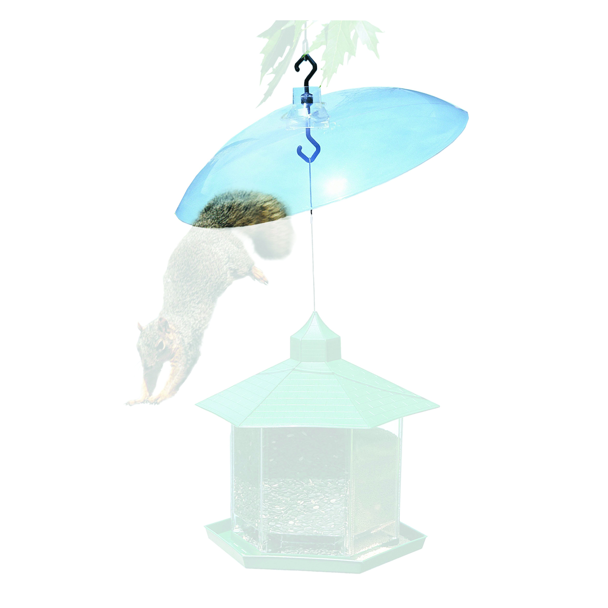 The Perky-Pet 16 in Transparent Squirrel Baffler can be hung or pole mounted. When hanging the baffler, it blocks squirrels from above. The included hooks have the strength to hold up to 12 lb. The top hook attaches the baffler to a tree limb or other hanging location, while the bird feeder hangs from the second hook located underneath the baffler. Most squirrels will descend the wire to the baffler and give up. A more persistent squirrel may put its weight on the baffler in efforts to access the bird feeder below, but after climbing onto the baffler, it will quickly tilt, sending the squirrel down to the ground (startled maybe, but uninjured). The hanging baffler has the added benefit of partially protecting bird seed from rain and tree debris.