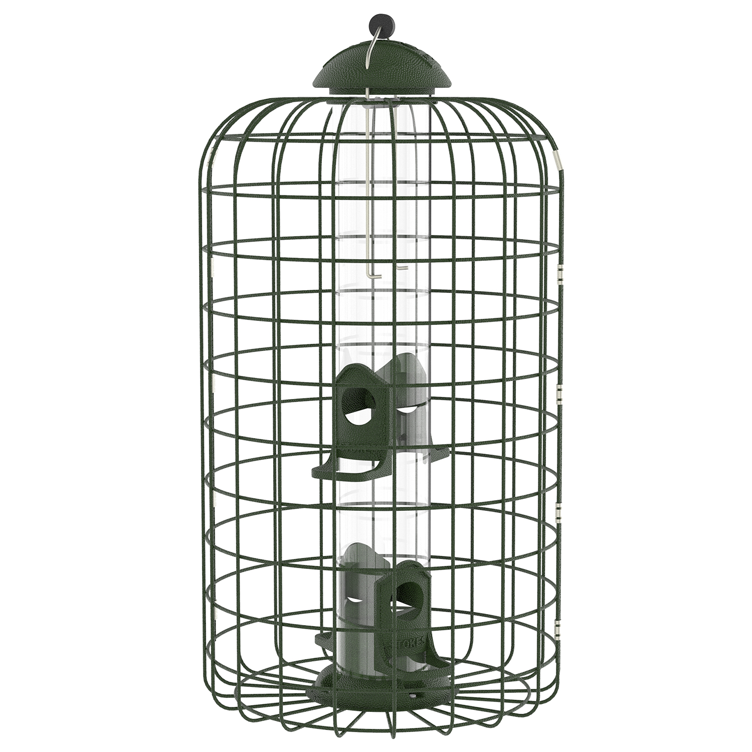 The revolutionary metal cage design keeps grey squirrels and larger birds like grackles out; while smaller songbirds easily fit through its cage openings to freely feed; safe from predators.