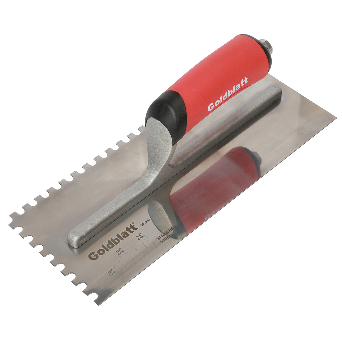 Mirror polished non-rust stainless steel trowel blade aluminum alloy mounting is very strong but light weight anti-turn ergonomic soft grip handle reduces fatigue blade measures 11 in x 4-1/2 in available in a variety of notch styles.