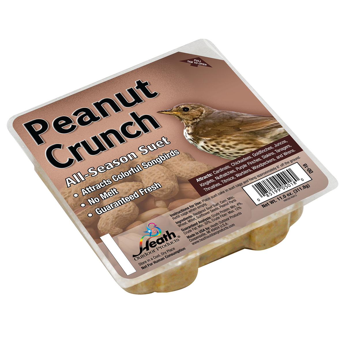 This heath peanut crunch all-season suet features bits of peanuts. It is perfect for attracting and pleasing: cardinals; chickadees; goldfinches; juncos; kinglets; nuthatches; purple finches; siskins; tanagers; thrushes; titmice; warblers; woodpeckers and wrens. Guaranteed fresh. Not for human consumption.