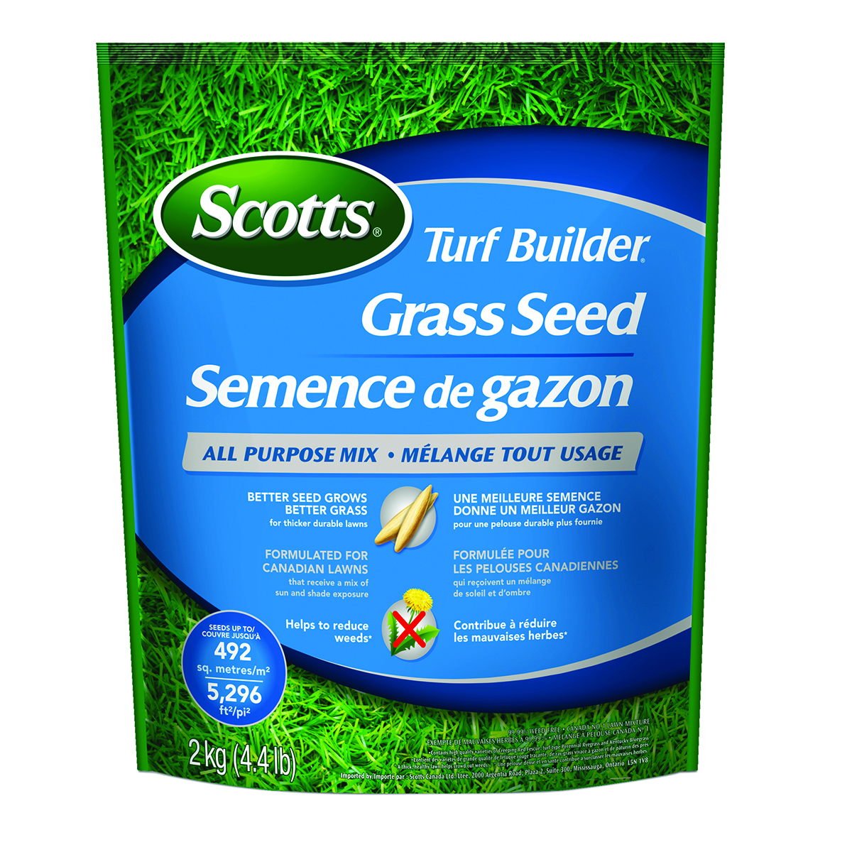 1 kg (2.2 lb) Package seeds up to 246 m2 (2; 648 ft2) To make a good lawn better; start with a high quality seed that grows a thick; green lawn. Scotts® Turf Builder® All Purpose Mix. Formulated with high-quality seed varieties; including turf-type Kentucky Bluegrass; this all-purpose mix is filtered 3 times to remove weeds and fillers for a 99.99% weed-free guarantee. Ideal for lawns that get a mix of sun and shade and can be applied in the Spring or Fall for a thicker; durable lawn that helps reduce weeds* Now; that’s a better way to seed and overseed.
