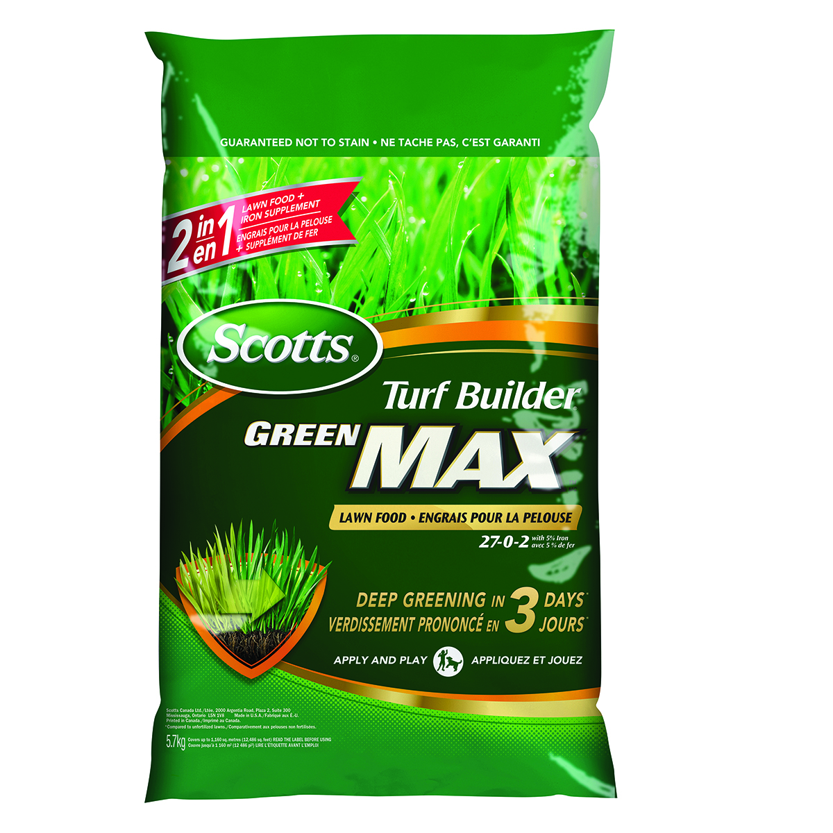 Some things need to happen in a hurry. If greening up your lawn is one of them; try Scotts Turf Builder Green MAX lawn food 27-0-2 with 5% Iron. This 2-in-1 lawn food plus iron supplement yields deep greening in 3 days. Apply in any growing season to any grass type; including newly seeded and sodded areas. Plus; with Scotts Turf Builder Green MAX lawn food 27-0-2 with 5% Iron; you can get back to enjoying your lawn faster. Guaranteed not to stain. Let's you apply and play right away. Kids; pets; and you won't have to wait to re-enter the lawn. That's about as fast as it gets.