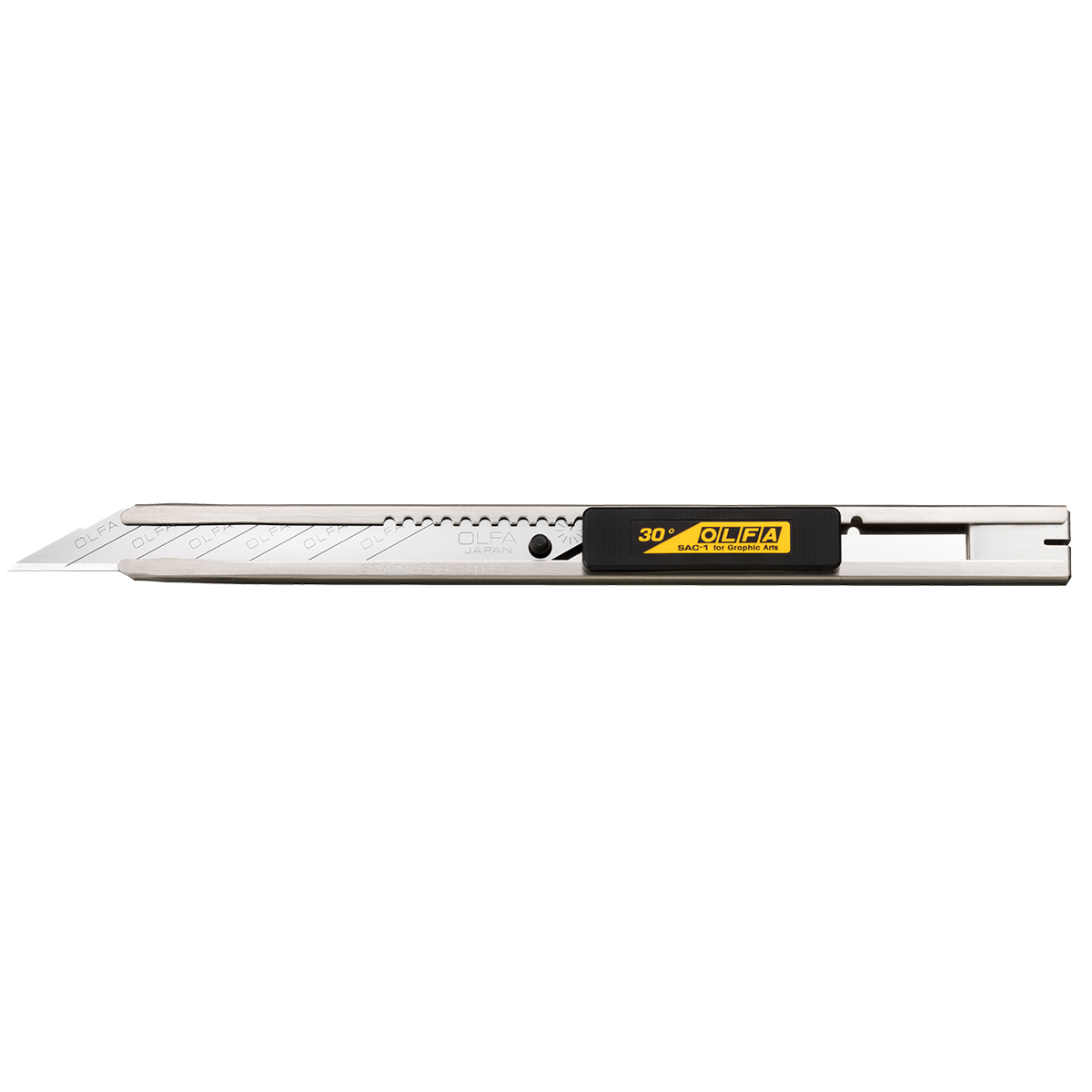 Elevate your cutting with the 9mm Stainless-Steel Graphics Knife with 30-Degree Precision Blade. The stainless-steel body resists rust and corrosion; making it ideal for use with paints; films; or other moist/damp applications. The auto-lock slide securely positions the blade into several pre-set depths with a single touch. The included pocket clip also doubles as a blade snapper when a new cutting edge is needed.