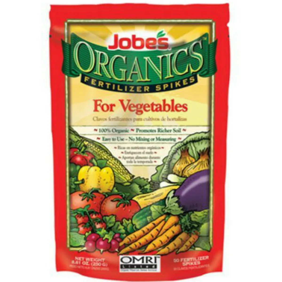 Fertilizer spikes vegetable jobes organic promotes richer soil. 100 percent organic. Easy to use. No mixing or measuring. Contains 50 fertilizer spikes.