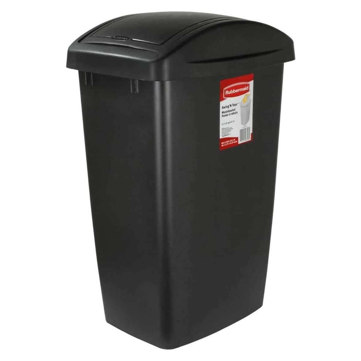 Rubbermaid Swing N Toss wastebasket is a 47.3 litre waste basket with domed swing lid and wide opening for "hands free" operation. The Contemporary design fits in narrow spaces. Lid and base is designed to completely conceal suitably sized garbage bags.