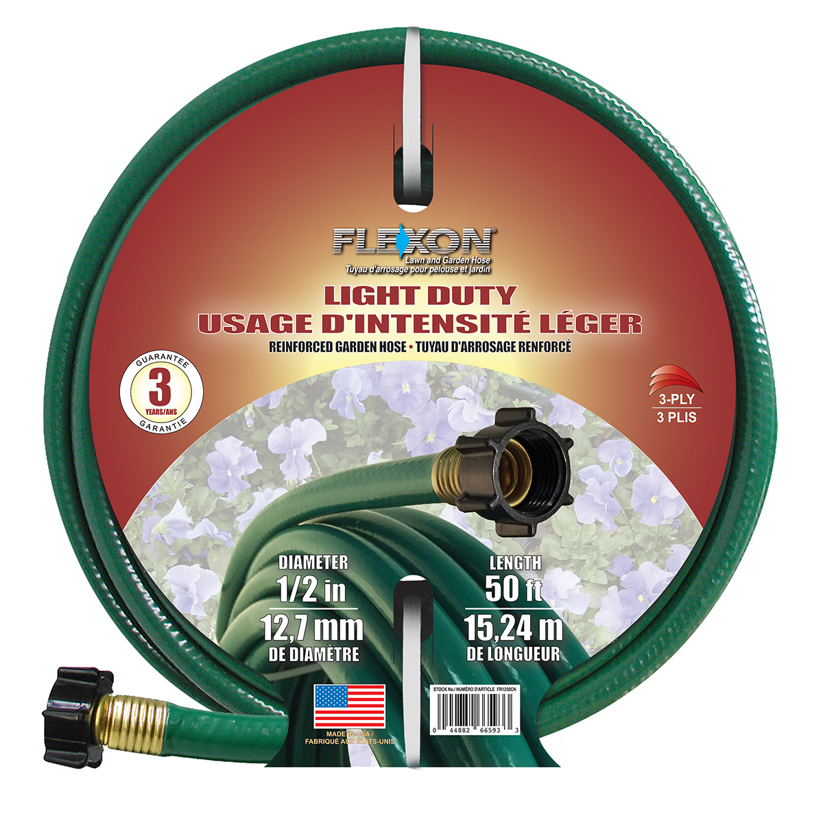 1/2 in x 50 ft Green light duty garden hose. Flexon s light-duty hoses are ideal for maintaining plants; lawns and gardens around your home. Best of all; our light duty hoses offer year-round flexibility even under tough weather conditions.