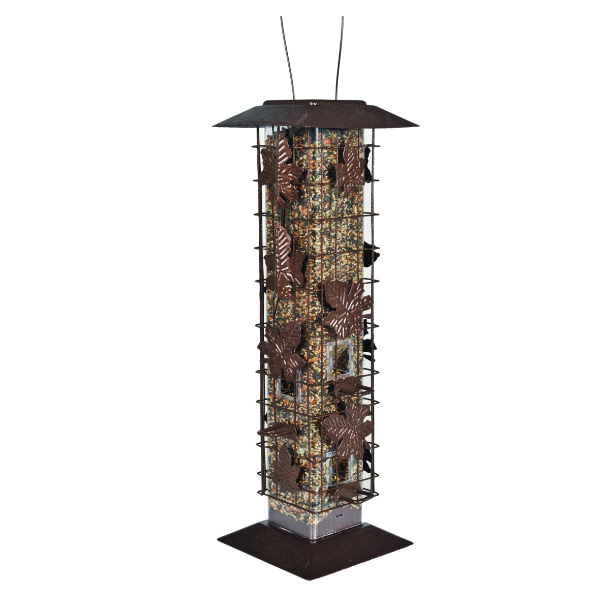 With the Perky-Pet Squirrel-Be-Gone Bird Feeder you get elegant design and squirrel-resistant function all in one convenient package. The metal cage is adorned with a leafy design that will look at home in any yard. In addition, the metal is finished with a powder coating to enhance the rustic look, while also ensuring rust resistance. To offer defense against squirrels, this feeder boasts multiple great features. First, this feeder’s weight-activated system is calibrated to support the weight of birds but not squirrels. When squirrels try to gain access to the perches, the cage is pulled down, causing the decorative leaves to cover the ports. In addition, the metal cage prevents squirrel chewing and damage. With less competition from squirrels, birds won’t be able to resist the Perky-Pet Squirrel-Be-Gone Feeder! It features six feeding ports evenly spaced around the reservoir so multiple birds can dine at the same time and you can enjoy a better view. In addition, this feeder has built-in drain holes to prevent water from pooling in the reservoir, so there’s less seed waste. Use the built-in hanging wire to place this attractive feeder anywhere around your yard or patio.