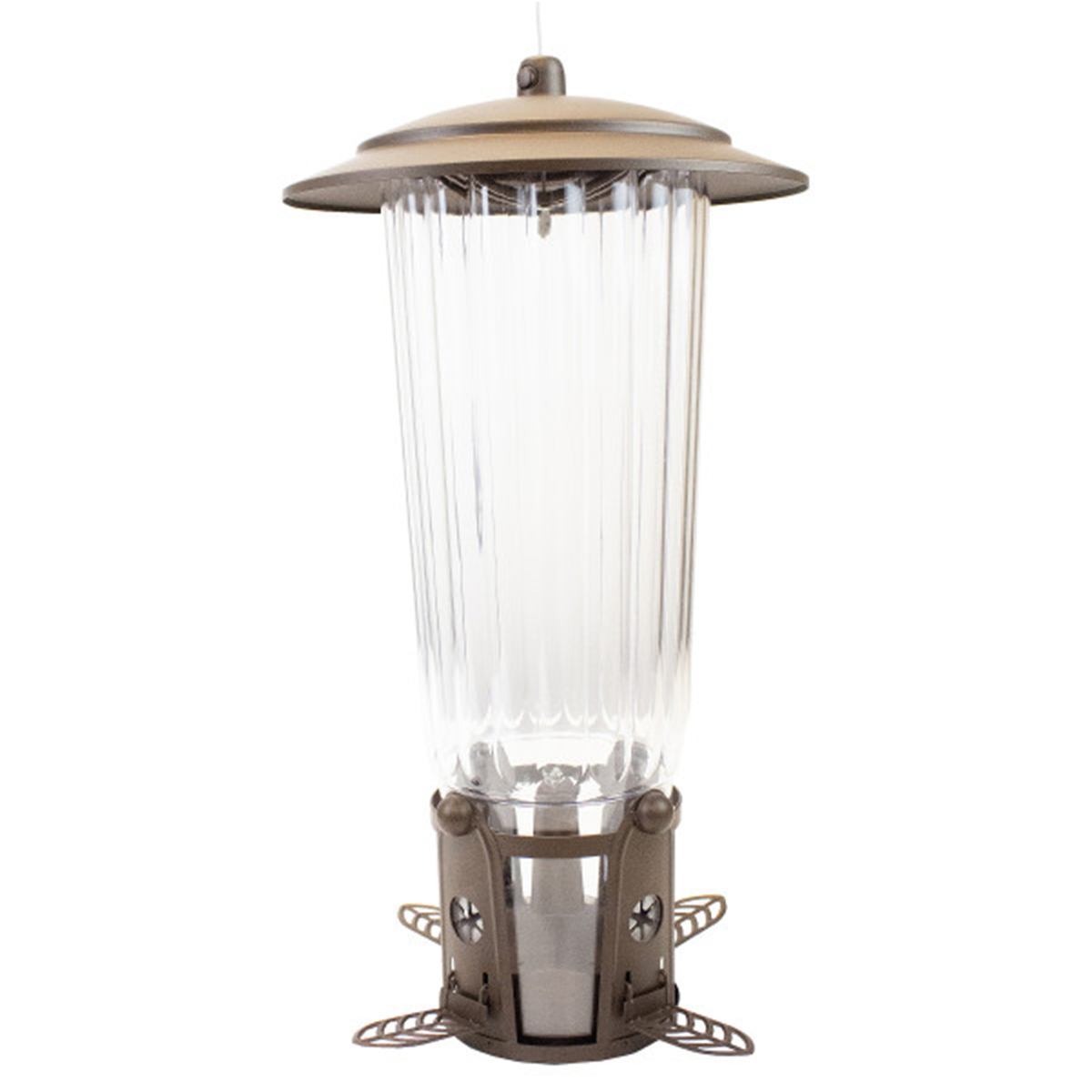 - Four feeding stations with Flexports prevent seed spillage and offer comfort for birds.