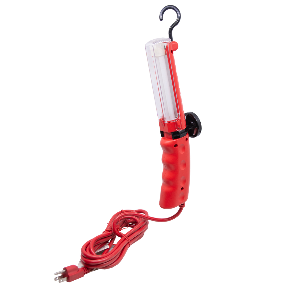 This fluorescent work light uses a single 13W fluorescent bulb. The amount of light produced is similar to that of a 75W incandescent bulb but with a daylight color (6500 kelvin). Acts as both a floodlight and a spotlight. With swiveling Hook and magnetic clip for hands-free use.