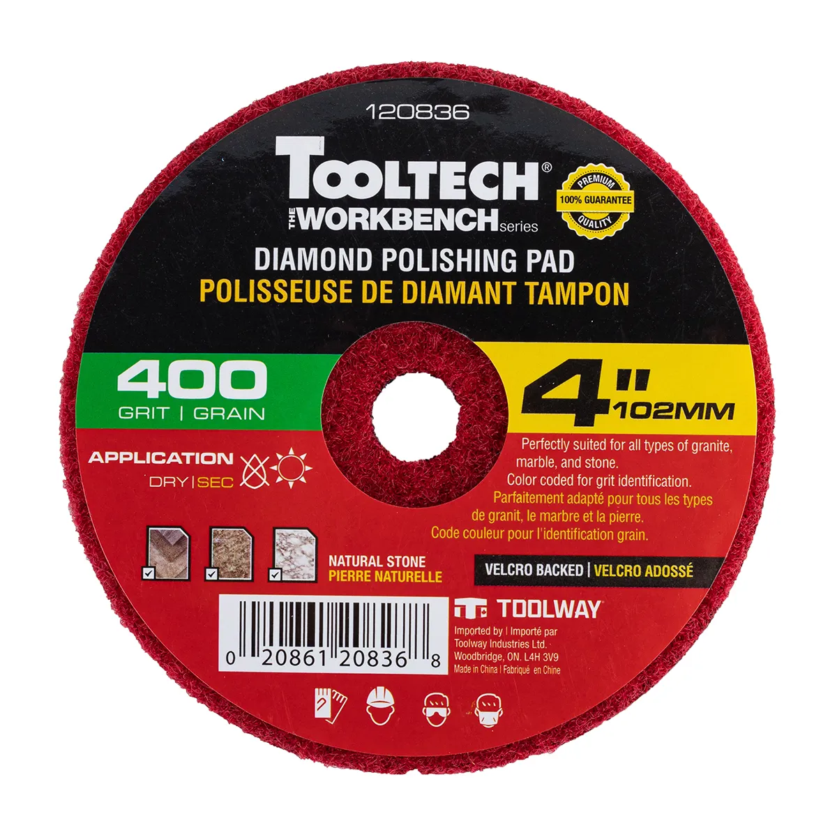 Tooltech’s® line of Workbench Series 4in polishing pads are designed for the grinding and polishing of marble, granite, ceramics, and other stone materials. Designed to fit most hand grinders, they are available in multiple grits, ensuring the proper one is chosen for the task at hand.  Pads are colour coded for quick grit identification and are hook and loop backed for rapid and effortless changing. These diamond pads are rated for high sharpness and are used dry.