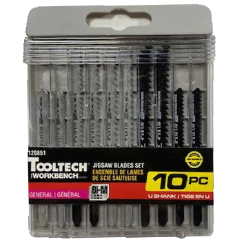 Jigsaw blades set for general use includes: (2) 4in x 8t blade for metal; (2) 3in x 21t blade for metal; (2) 4in x 10t blade for metal; (2) 4in x 8t blade for wood; (2) 3in x 12t blade for wood.