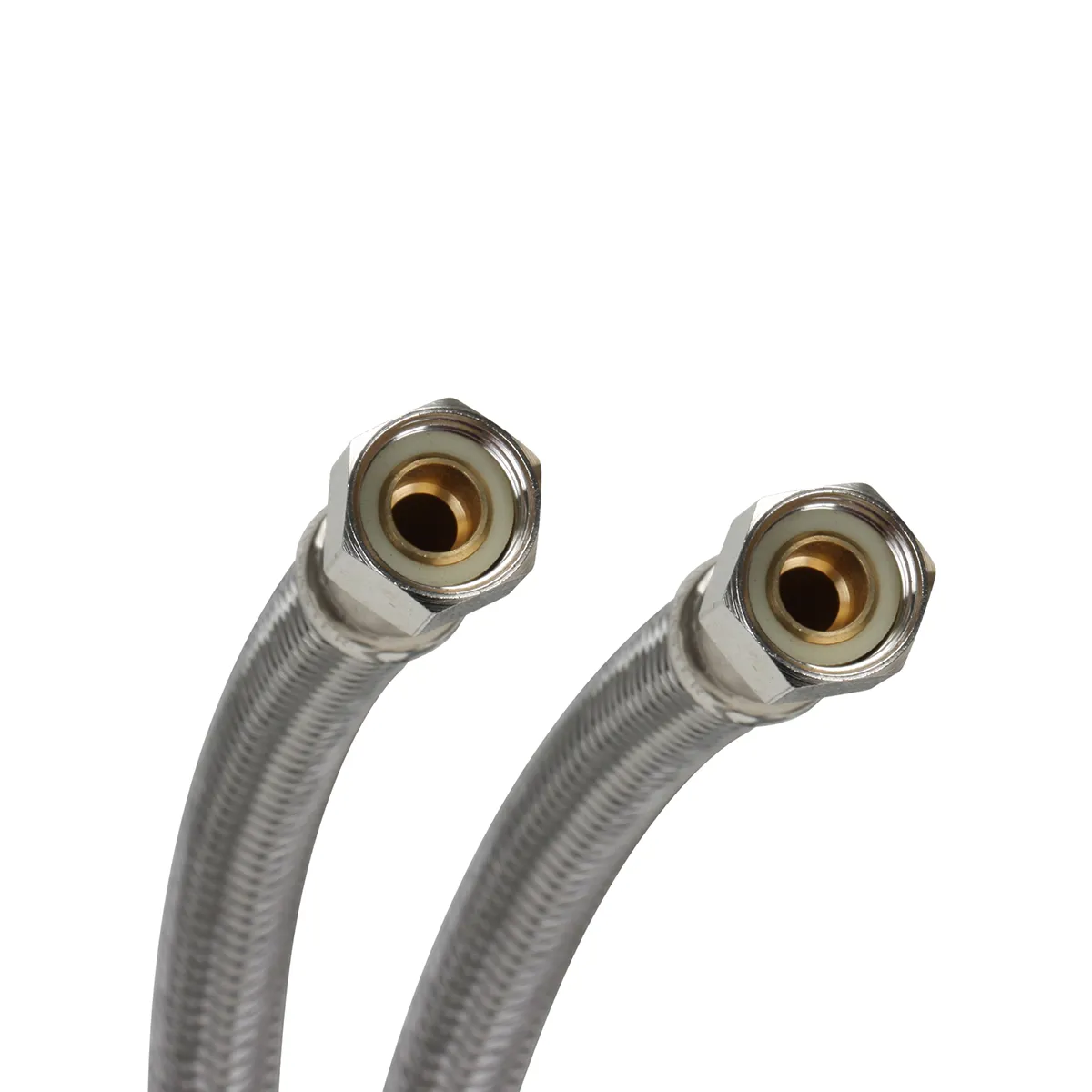 Sink supply lines; braided stainless steel; flexible 'no-burst'; 3/8 inches female compression by 3/8 inches female compression; 12 inches long. High Bursting strength; each foot of No-Burst contains 250 feet of stainless steel wire. Stainless ferrules are extra-long with added crimps for added security. Non toxic polymer core resists chlorine and chloramines. Captive cone washers seal tightly. Ex ceptionally flexible for fast easy installation. Won't kink or crease in the tightest of spaces. Easy to grip; nickel plated brass hex nuts. Exceeds all plumbing code requirements. Meets agency standards. IAPMO Standard; PS74-95; CSA; SBCCI; FDA; NSF-61. Fluidmaster water supply connectors are built to last. Made of tough core covered with braided stainless steel wire; these connectors exceed code requirements for durability. They also have a large inside diameter for high flow capacity. High Bursting strength; each foot of No-Burst contains 250 feet of stainless steel wire. Stainless ferrules are extra-long with added crimps for added security. Non toxic polymer core resists chlorine and chloramines. Captive cone washers seal tightly. Ex ceptionally flexible for fast easy installation. Won't kink or crease in the tightest of spaces. Easy to grip; nickel plated brass hex nuts. Exceeds all plumbing code requirements. Meets agency standards. IAPMO Standard; PS74-95; CSA; SBCCI; FDA; NSF-61.