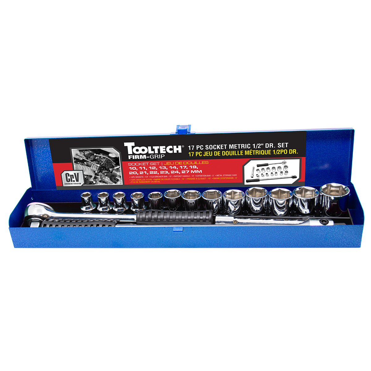 The Tooltech FirmGrip 17 piece socket metric 1/2in drive Cr-V Set.