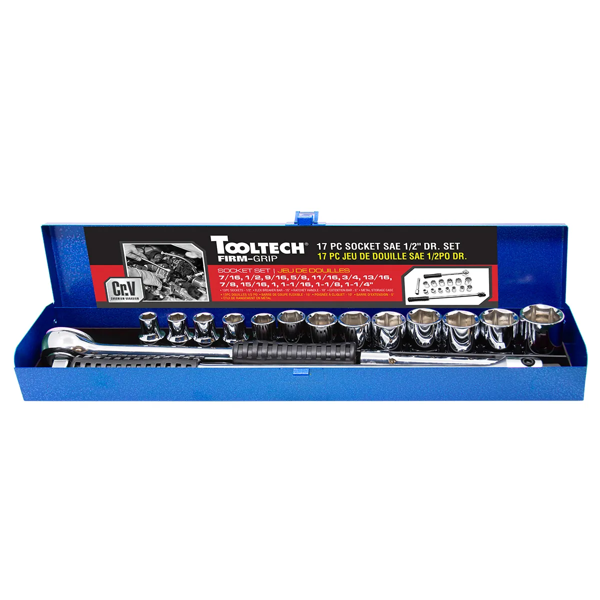 The Tooltech 17 piece socket set SAE 1/2 in drive Cr-V for for hand tools.