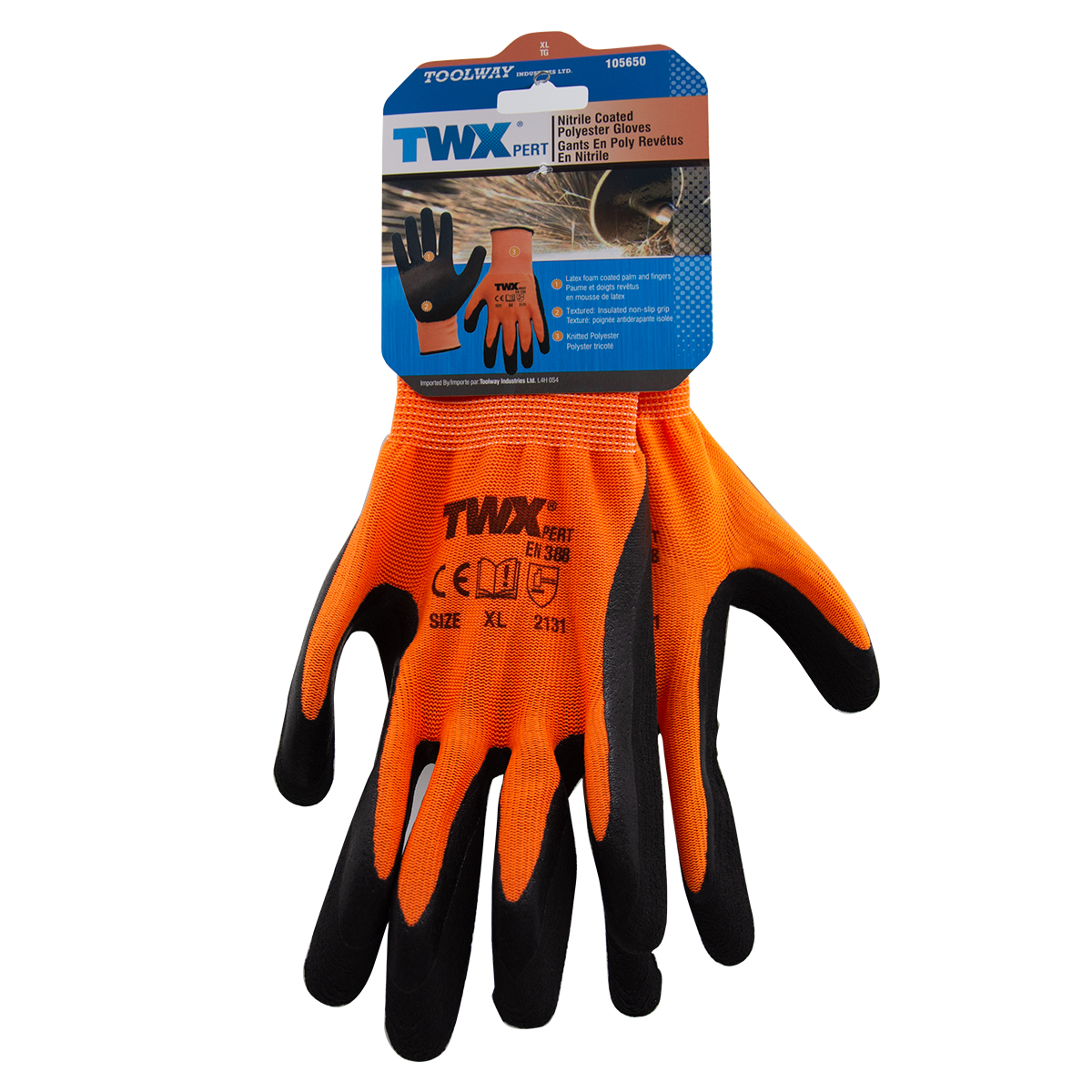 1dz. Knitted Polyester Gloves Orange with Latex Foam Black Palm (XL)