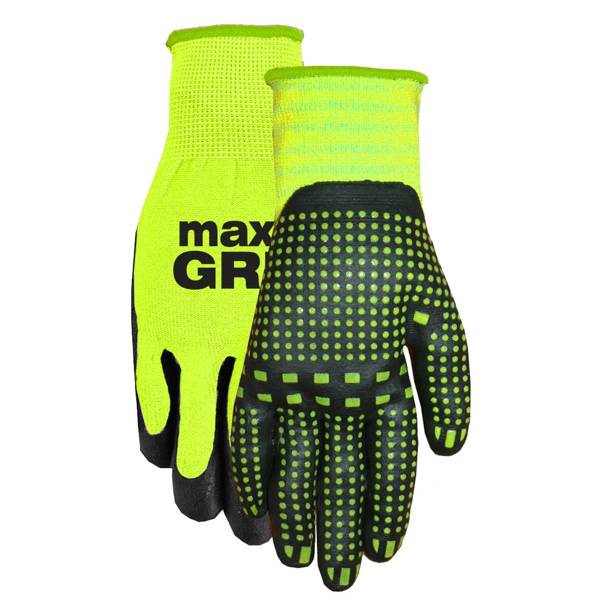• Hi-vis max grip 15 gauge nylon/spandex liner with foam nitrile coated palm; and foam nitrile dots on palm.
