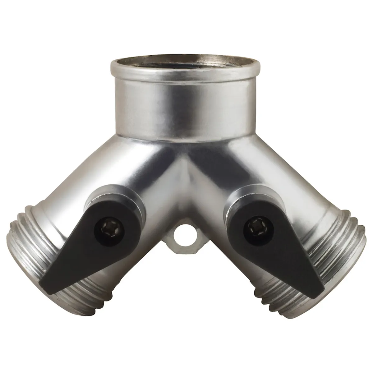 Attach the metal 2-way hose valve to an existing faucet to maximize your flexibility. Independent front levers are easy to use so you can turn the water on and off or adjust the flow without twisting a difficult knob. Water two separate areas at once; or keep your sprinkler set-up and a hose available to run water whenever you need it.