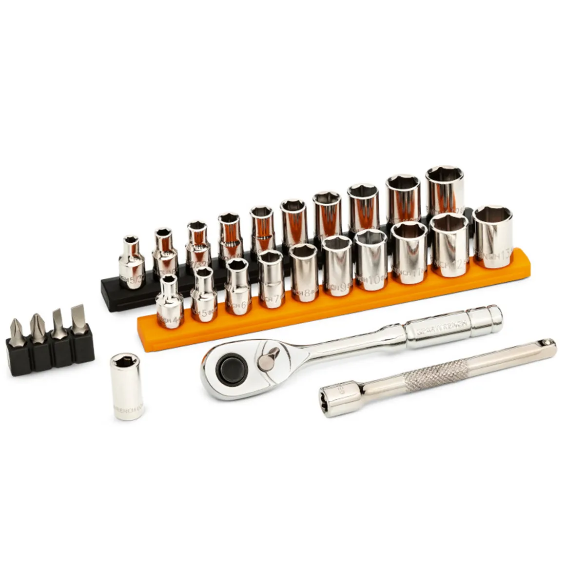 • Also included in the set are 1 quick-release 1/2in drive ratchet; 1 extension; 1 magnetic bit holding screwdriver and 4 frequently used bits.
