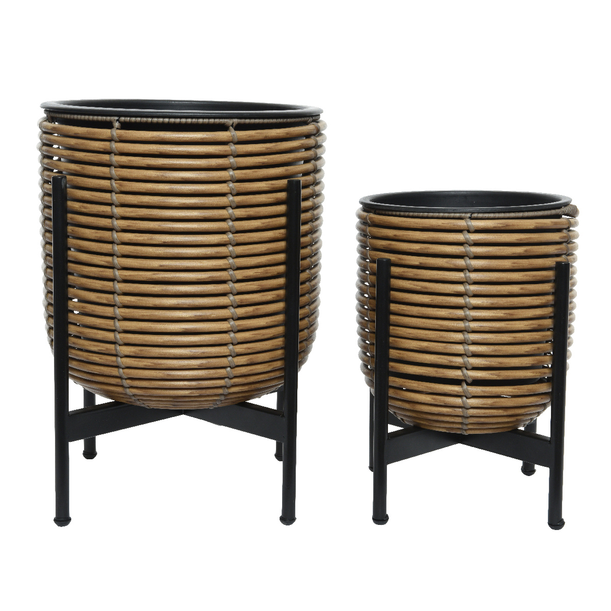 Make outdoor spaces uniquely your own with a Jolie Planter set from the ProYard® Décor Deluxe Collection. These beautiful poly-rattan planter sets feature hand-woven wicker in two finishes, are lightweight, waterproof, weather, and UV resistant. Perfect for indoor or outdoor use, each planter comes with a 4-legged iron stand, liner with drain hole knock-out and plug.