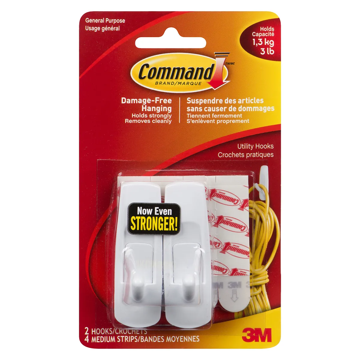 Command™ hooks are available in a wide range of designs to match your individual style and décor. They also come in a variety of sizes and hold a surprising amount of weight. Re-hanging the Command™ Utility Hooks is as easy as applying a replacement Command™ mounting strip; so you can take down; move and reuse them again and again! Command™ utility hooks hold up to 3 pounds (1.36 kg). Damage-free hanging on a variety of surfaces. Reusable mounting solution that offers a strong hold.