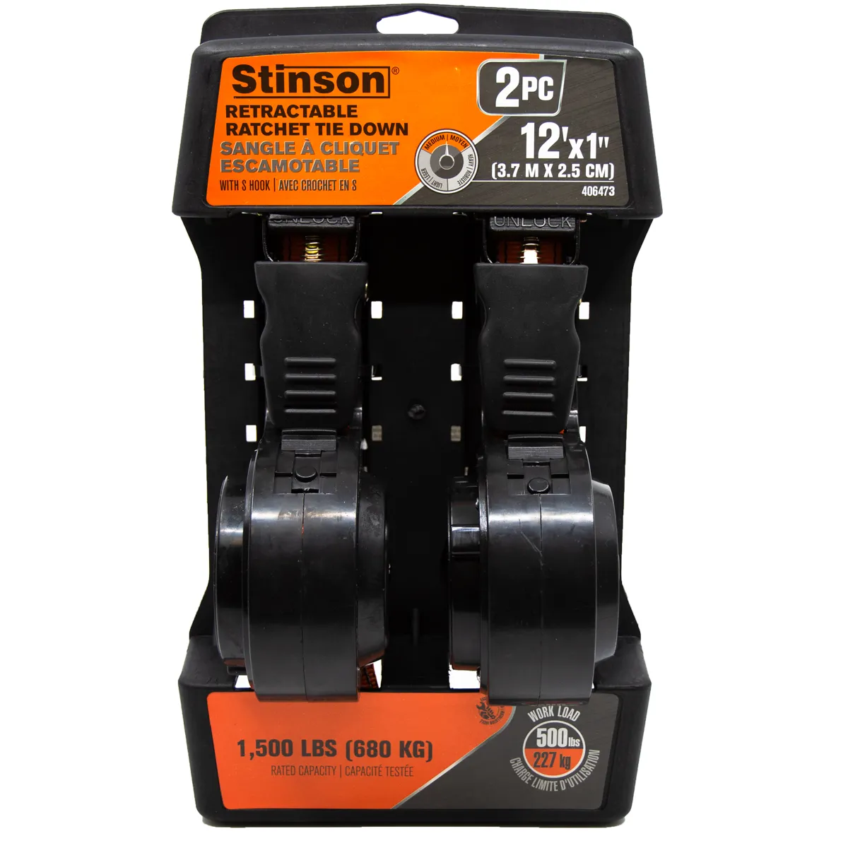 The Stinson Cargo Retractable ratchet tie-down. These straps are ideal to keep in your vehicle so they are handy whenever you need them. The Retractable Ratchet strap is one of the easiest to use on the market. By simply pressing the button; you can take up the slack before tightening; and retract all the webbing like a tape measure until you need it again. After taking up the slack; you still need to ratchet tight.