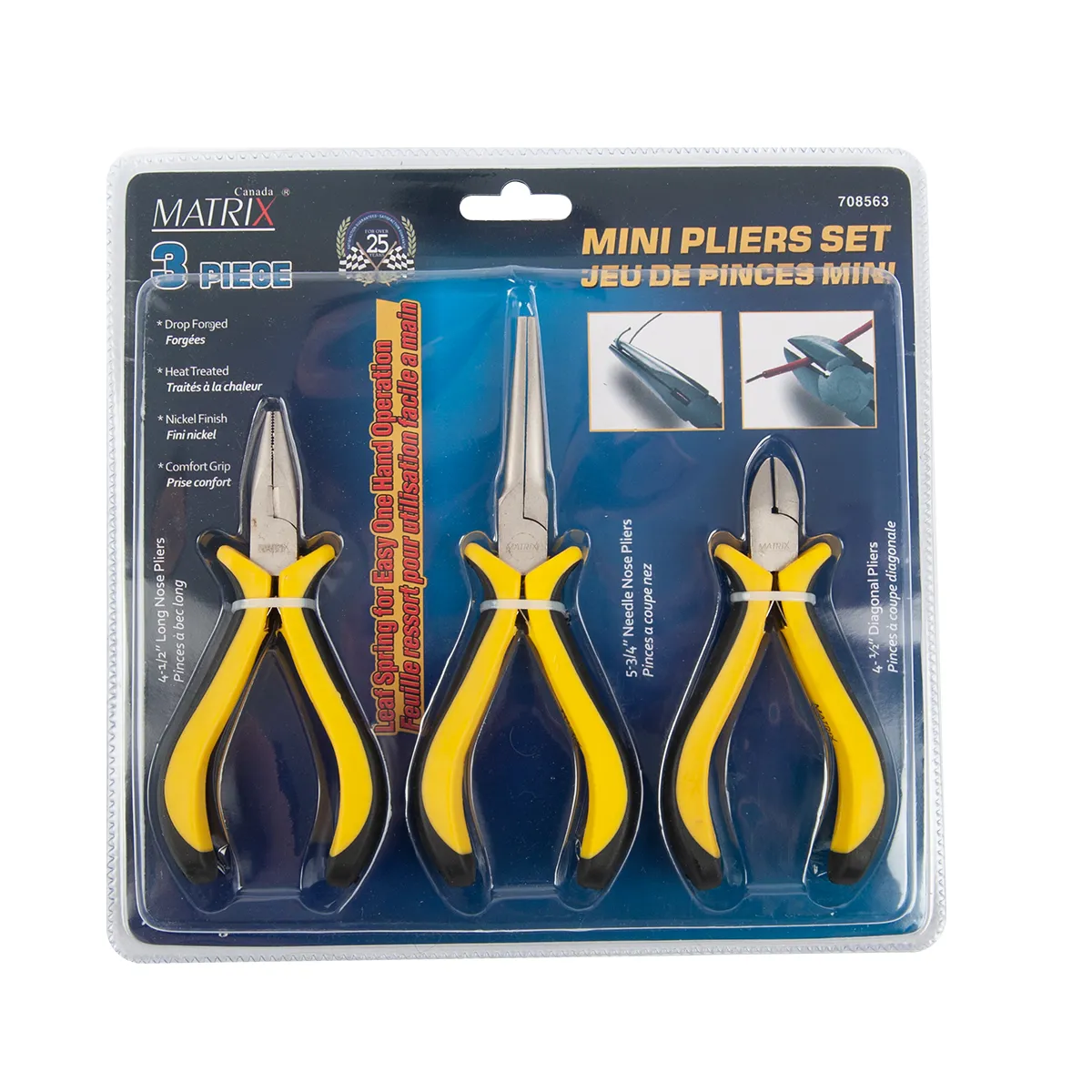 Includes: (1) Long nose pliers 4-1/2in | (1) Needle nose plier 5-3/4in | (1) Diagonal pliers 4-1/2in.