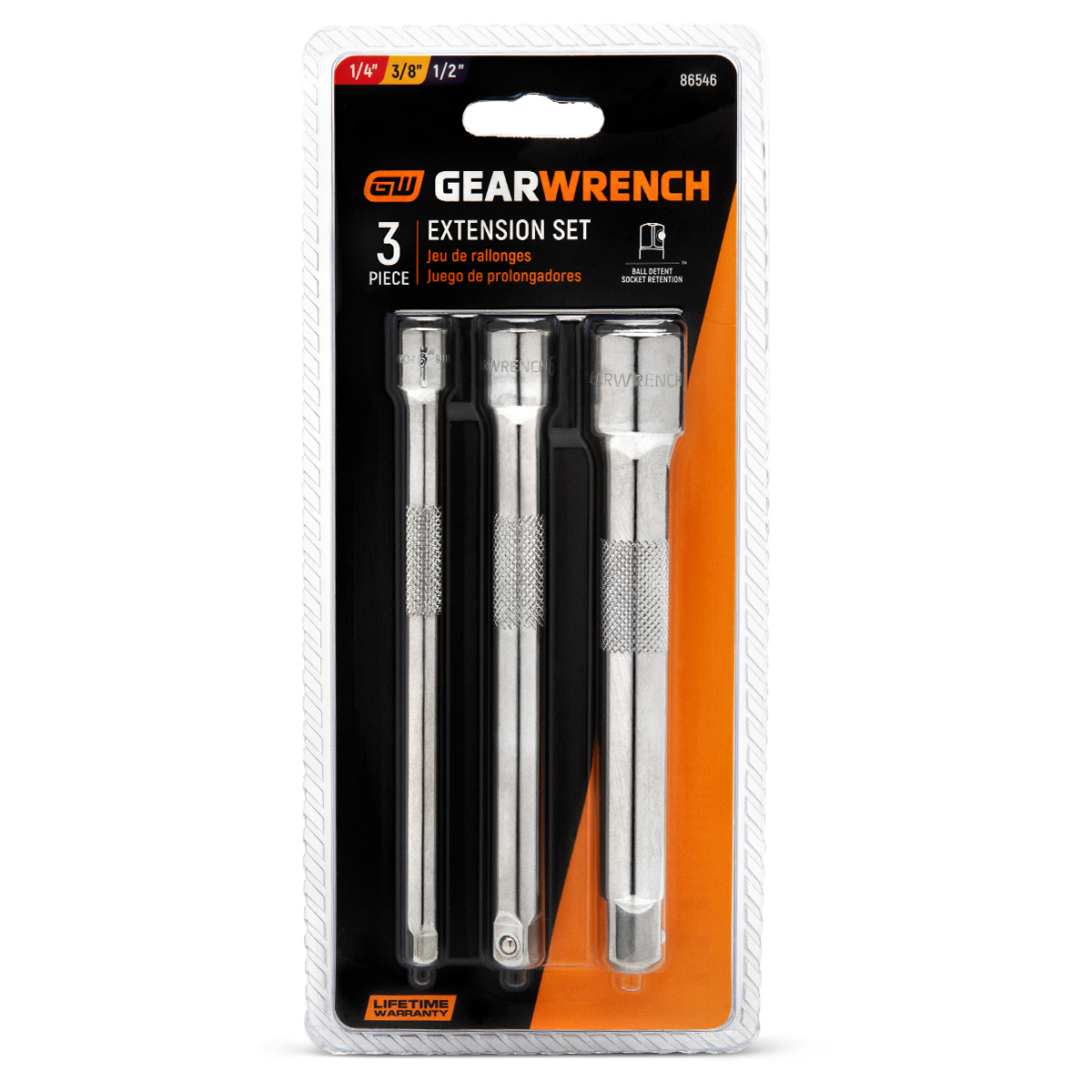 The GEARWRENCH 3pc 6in Extension Set (1/4in; 3/8in; 1/2in Drive) provides extra reach for hard-to-access fasteners; making it an essential tool for mechanics and DIYers alike.