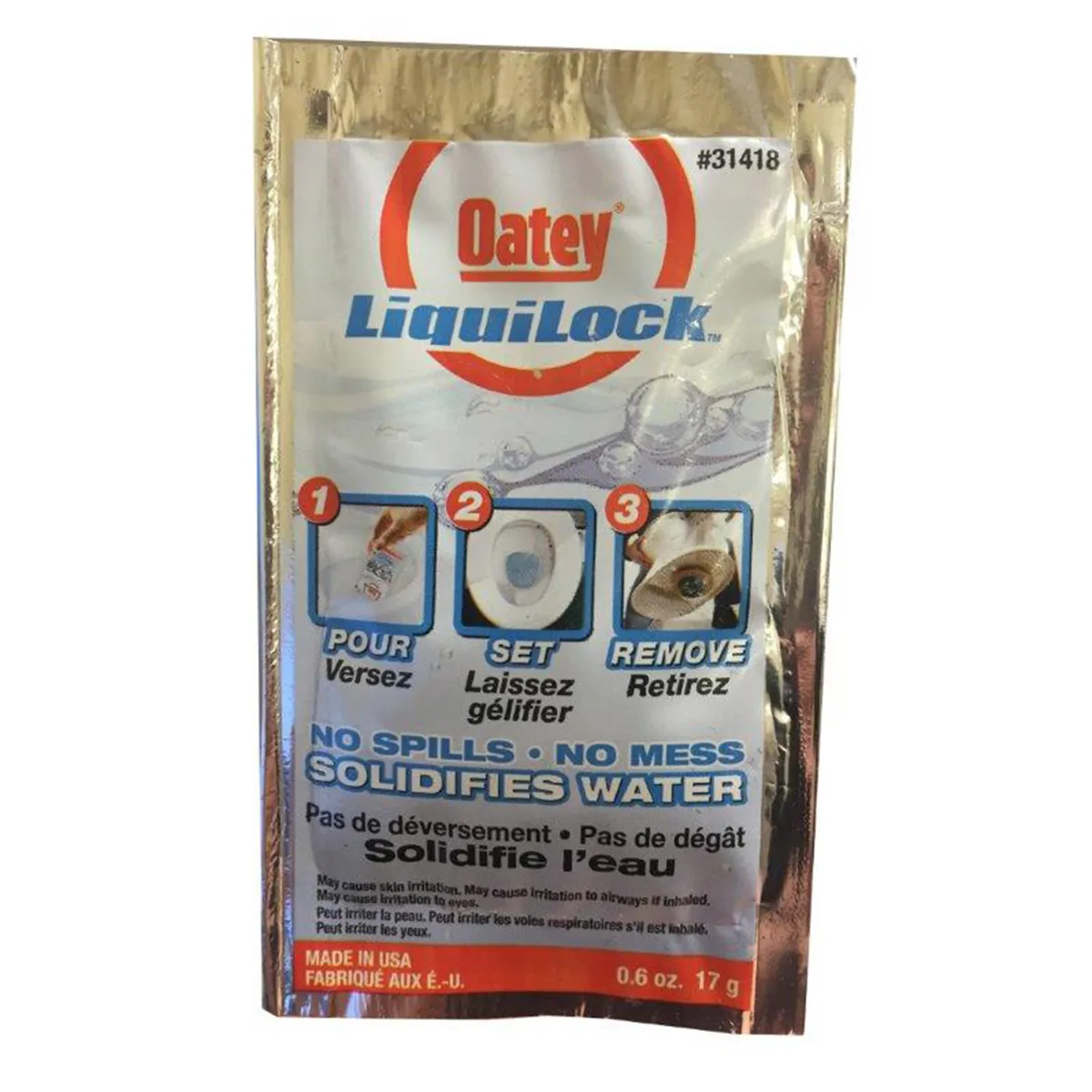 Oatey® Liquilock™ solidifies water in 4-5 minutes to help prevent drips and leaks when removing toilet fixtures. Gel dissolves when additional water is added. Oatey products have earned the trust of plumbing professionals for over 100 years.