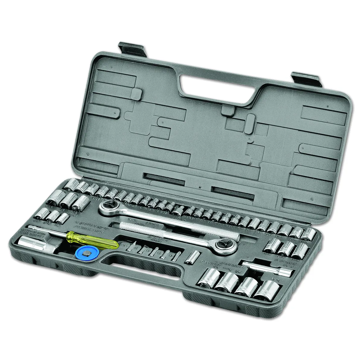 Set includes: (1) 8in (3/4in Drive) Reversible ratchet handle | (1) 10in (1/2in drive) reversible ratchet handle | (1) 3in extension bar | (1) spinner handle | (1) socket adapter | (2) spark plug socket | (1) spin disc | (15) 1/4in drive sockets - SAE | (3) 3/8in drive sockets - SAE | (12) 1/4in drive sockets - Metric | (3) 3/8in drive sockets - Metric | (10) 1/2in drive sockets - Metric | (1) carrying case.