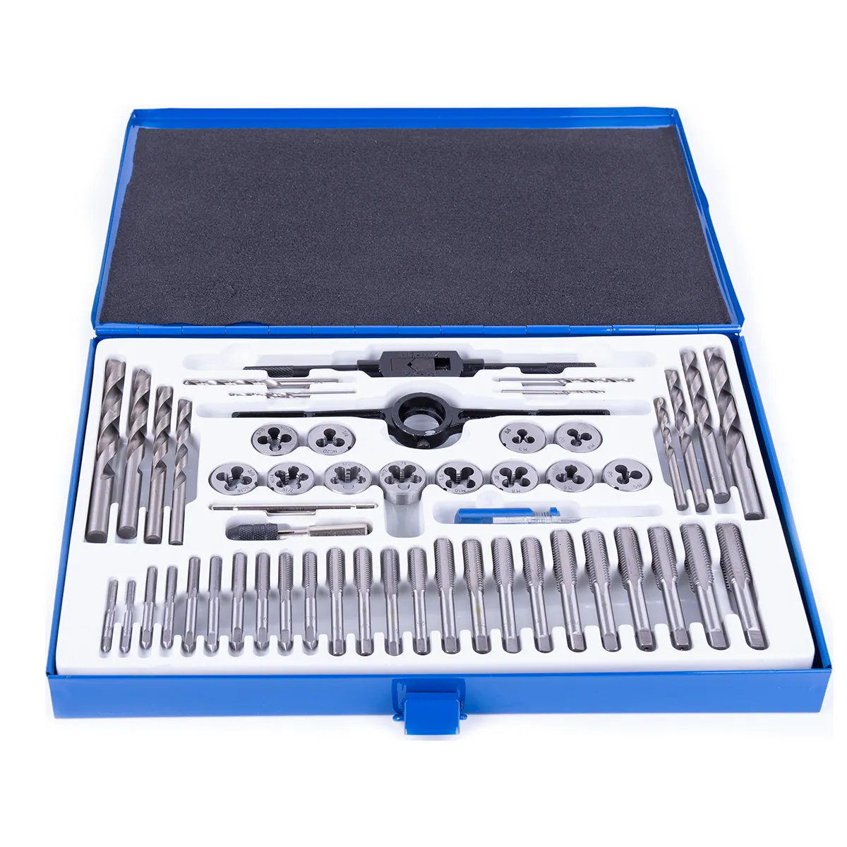 - Includes: (24) Taps + 12 Dies: M3X0.5, M4X0.7, M5X0.8, M6X1, M8X1.25, M10X1.5, M12X1.75, 1/4in-20NC, 5/16in-18NC, 3/8in-16NC, 7/16in-14NC, 1/2in-13NC, (12) Drill bits: 2.5mm, 3.3mm, 4.2mm, 5mm, 6.8mm, 8.6mm, 10.3mm, 13/64in, 17/64in, 5/16in, 3/8in, (1) T Handle die wrench, (1) T-handle tap wrench, (1) Tap wrench, (1) Mini screwdriver, (1) Metal storage case.