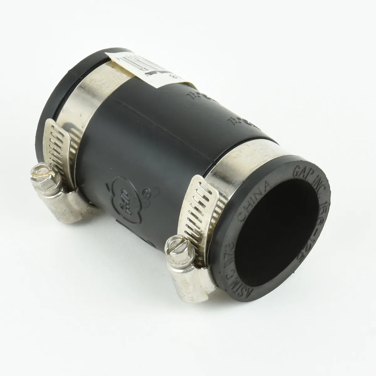 Flexible coupling designed for connecting PVC to cast iron pipe.