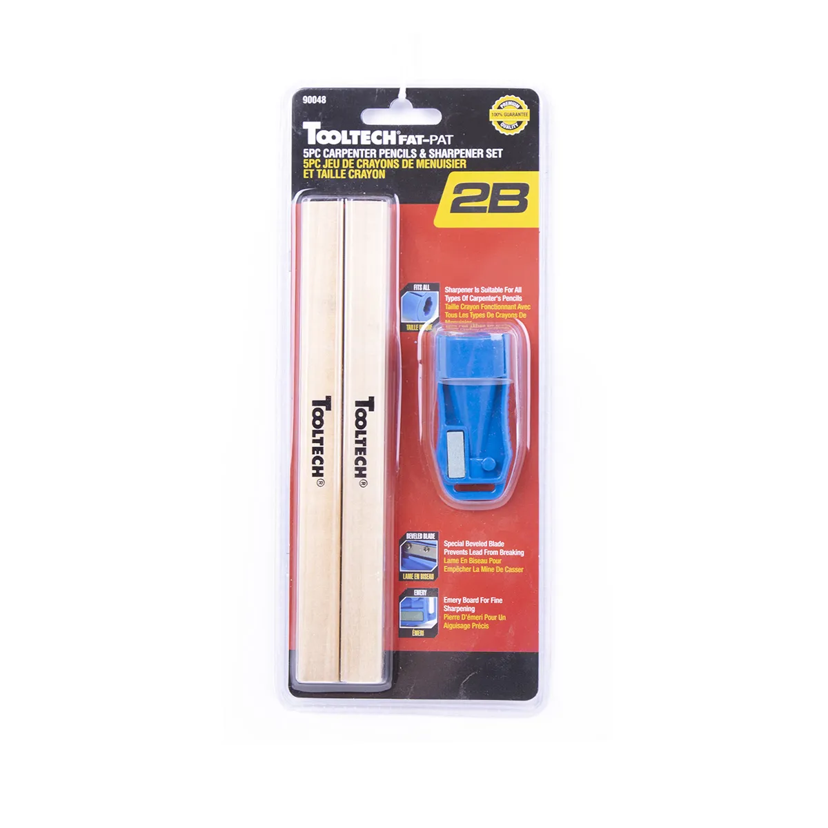 The Tooltech FatPat carpenter’s pencils and sharpener 5 piece set offers a compact and reliable marking solution for everyday use. It includes durable carpenter pencils and a specially designed sharpener for clean and precise points. The sharpener features a beveled blade that helps reduce lead breakage and improve pencil life. An integrated emery board allows for fine sharpening, giving you better control and accuracy on every mark.