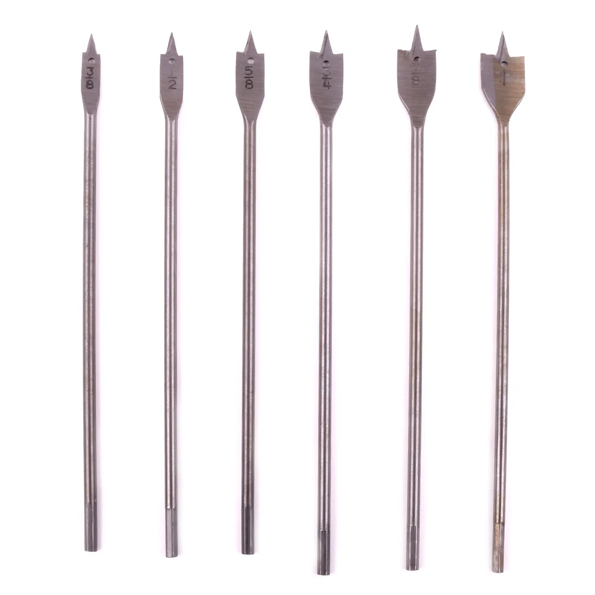 6pc wood spade drill bit set Includes: 3/8in, 1/2in, 5/8in, 3/4in, 7/8in, 1in.