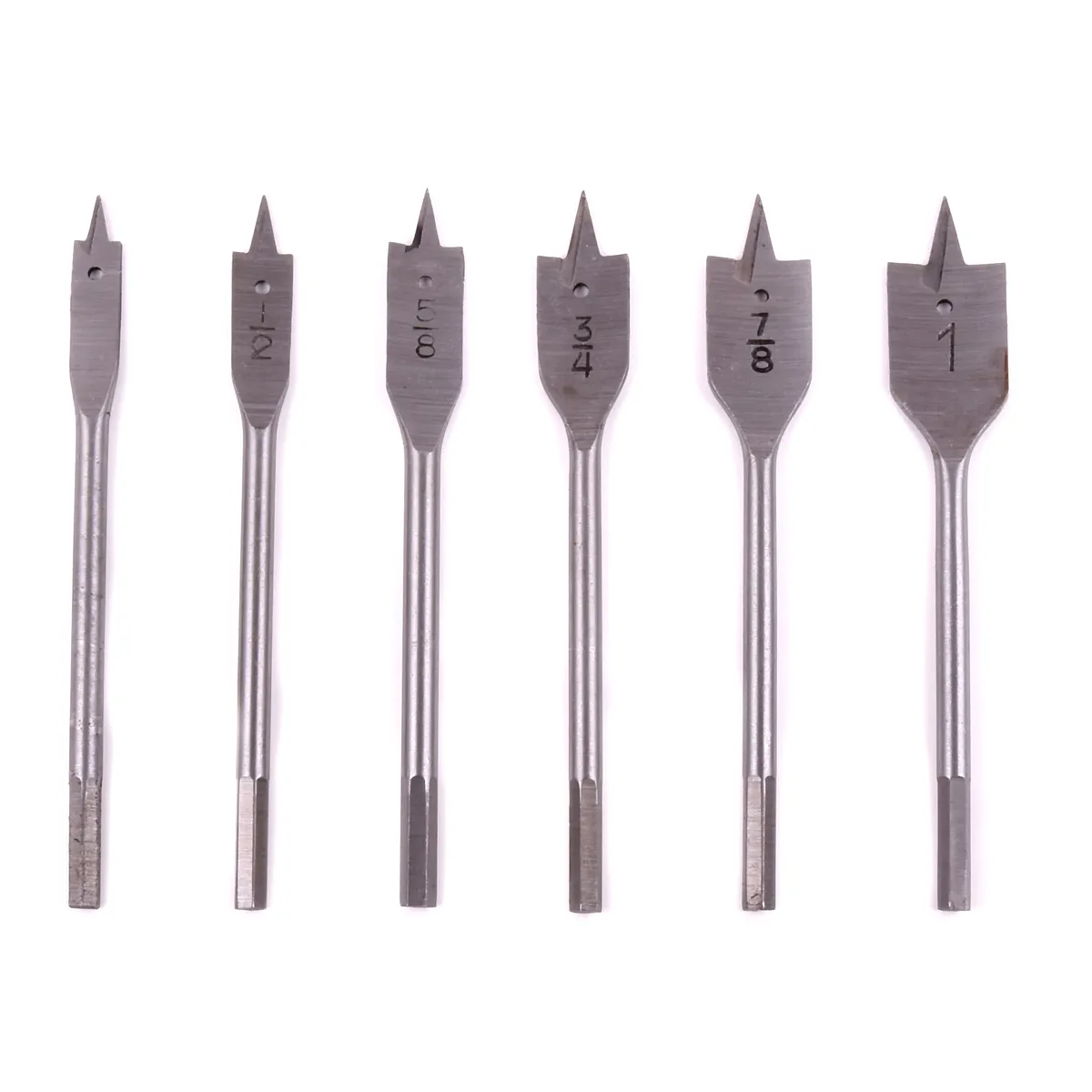 6pc wood spade drill bit set Includes: 3/8in, 1/2in, 5/8in, 3/4in, 7/8in, 1in.