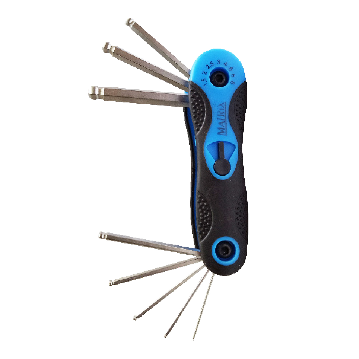 This metric 8 pc ball point hex key set is the essential tool for any home or job site. Constructed from hardened metal for durability and years of use; the ball end design also makes working with hex screws at sharp angles a breeze. Equipped with the most popular sizes; the fold away design also makes storing and transporting the hex keys a snap.
